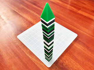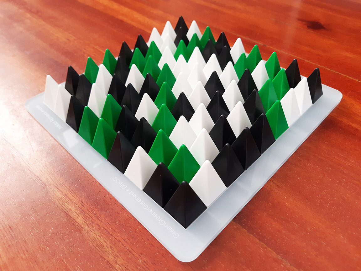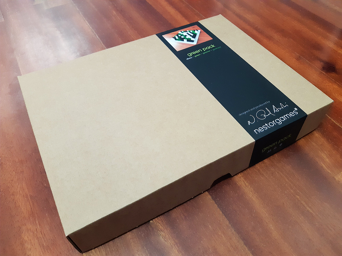 The Green Pack is a compilation of 4 games: Green, Greener, Greenest and Divoc. - Green is a game for 3 players derived from The House Of The Flying Blades, by the same designer, that uses a non-transitive capturing mechanism. - Greener is a capturing game for 2 players, where both must capture the same colour. - Greenest is a solo puzzle with the same mechanism as Green. - Divoc is a 2 player game (with a variant for 3). In Divoc, players compete to arrange their pyramids into a single connected group by moving them atop others. Divoc was designed during the Covid-19 lockdowns in Spain (Divoc is Covid in reverse). Materials: Laser-cut acrylic board (21x21 cm, 5mm thick), 40 green pyramids, 40 black pyramids, 40 white pyramids (stackable; 2x2x3 cm), big box. You can also check the edition with flexible board here. Rules in English | 日本語ルール | GreenGreenerGreenest page on boardgamegeek | Divoc page on boardgamegeek | Greener video review (XVGames edition) | Video review (Japanese) |
