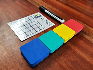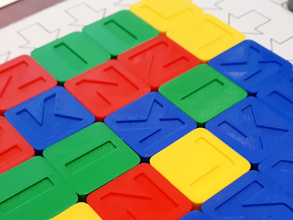 Material: Cardboard box, board with a scoring track and an 8×8 square grid (the rack) with an inner 6×6 area (the kiln ), four 5×5 grids with plastic coating (warehouses), 8 discs in 4 colours (2 each of red, blue, green, yellow), 7 grey discs, one black disc, 4 erasable markers, 4 whiteboard erasers (one of each colour), 36 square tiles in four colours and one black square tile, all the same size as the cells of the rack. The tiles are 5mm thick and 3D printed. The board is made of thin outdoor canvas (flexible, washable and resistant).