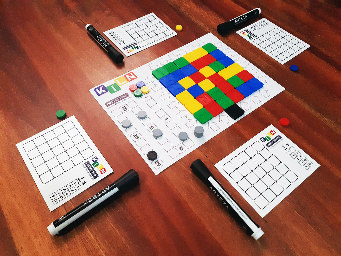 In KILN 2 to 4 players compete to manufacture tiles for the publishers of tile-laying games (such as nestorgames itself). All players share the same kiln, but each one has their own warehouse to store and sell the tiles to the publishers.